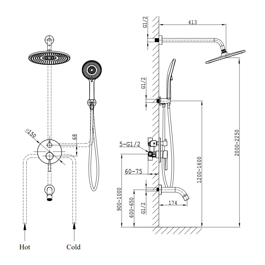 смеситель; монтажный блок; верхний душ; кронштейн верхнего душа; ручной душ; душевой шланг; настенный держатель; излив; инструкция.