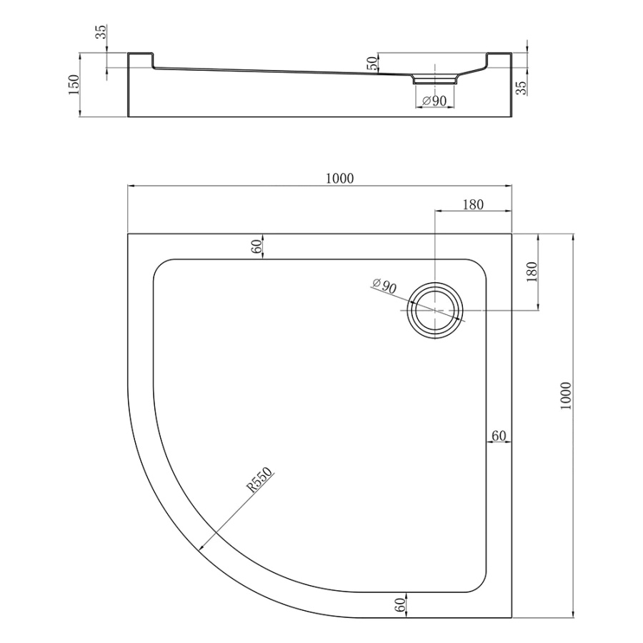 Поддон для душа Veconi Tezeo 100x100 белый, четверть круга, акрил, с сифоном