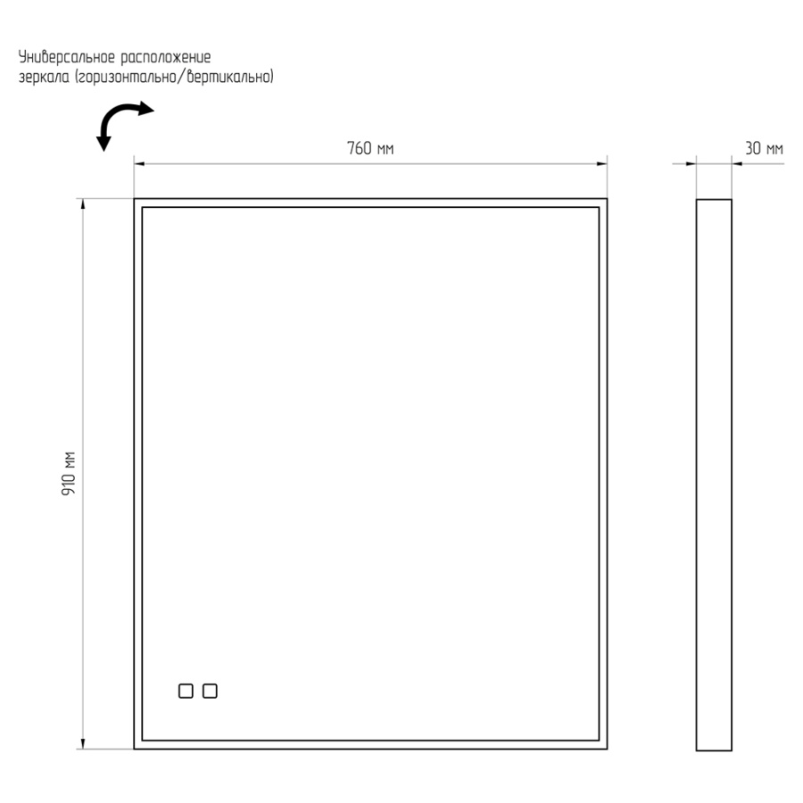 Зеркало из серебра без меди толщиной 5 мм с защитной пленкой сзади. Три цветовые температуры. Водонепроницаемость IP44. Мощность нагрева: 28 Вт. Мощность подсветки: 15.5 Вт.