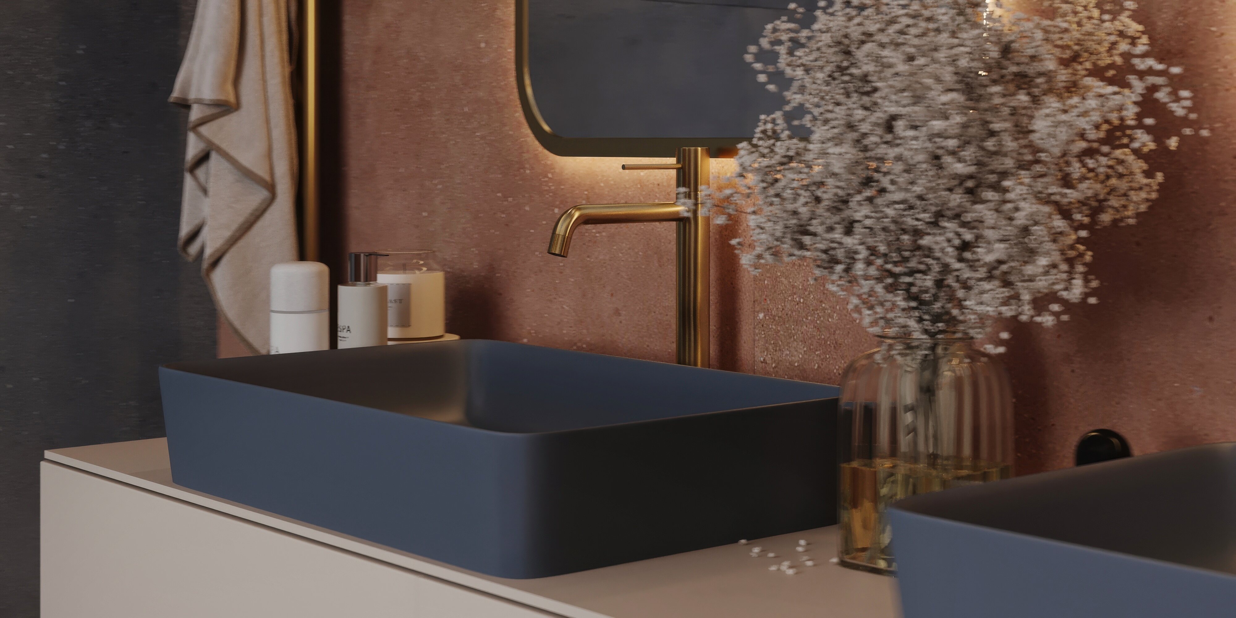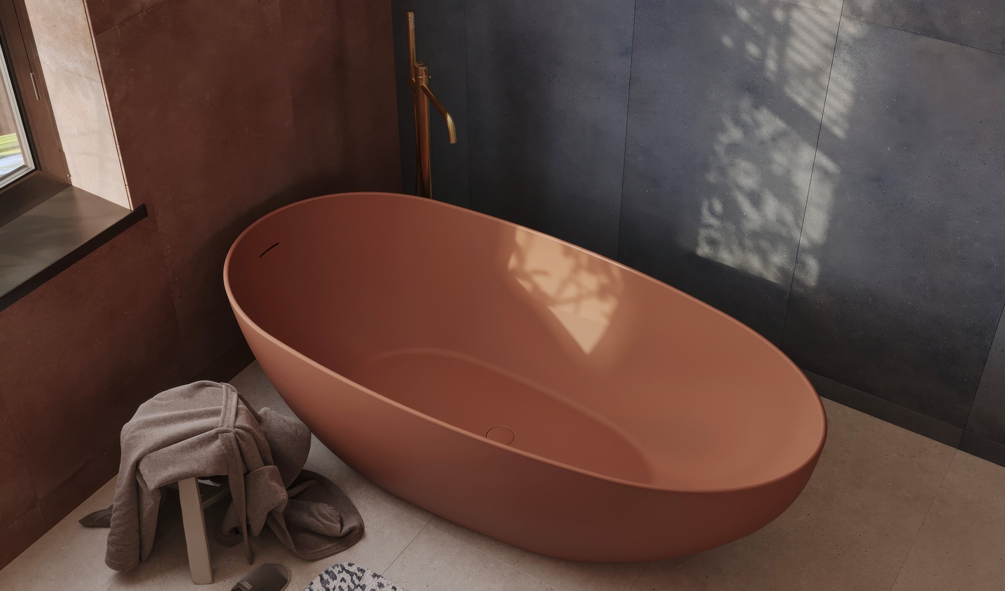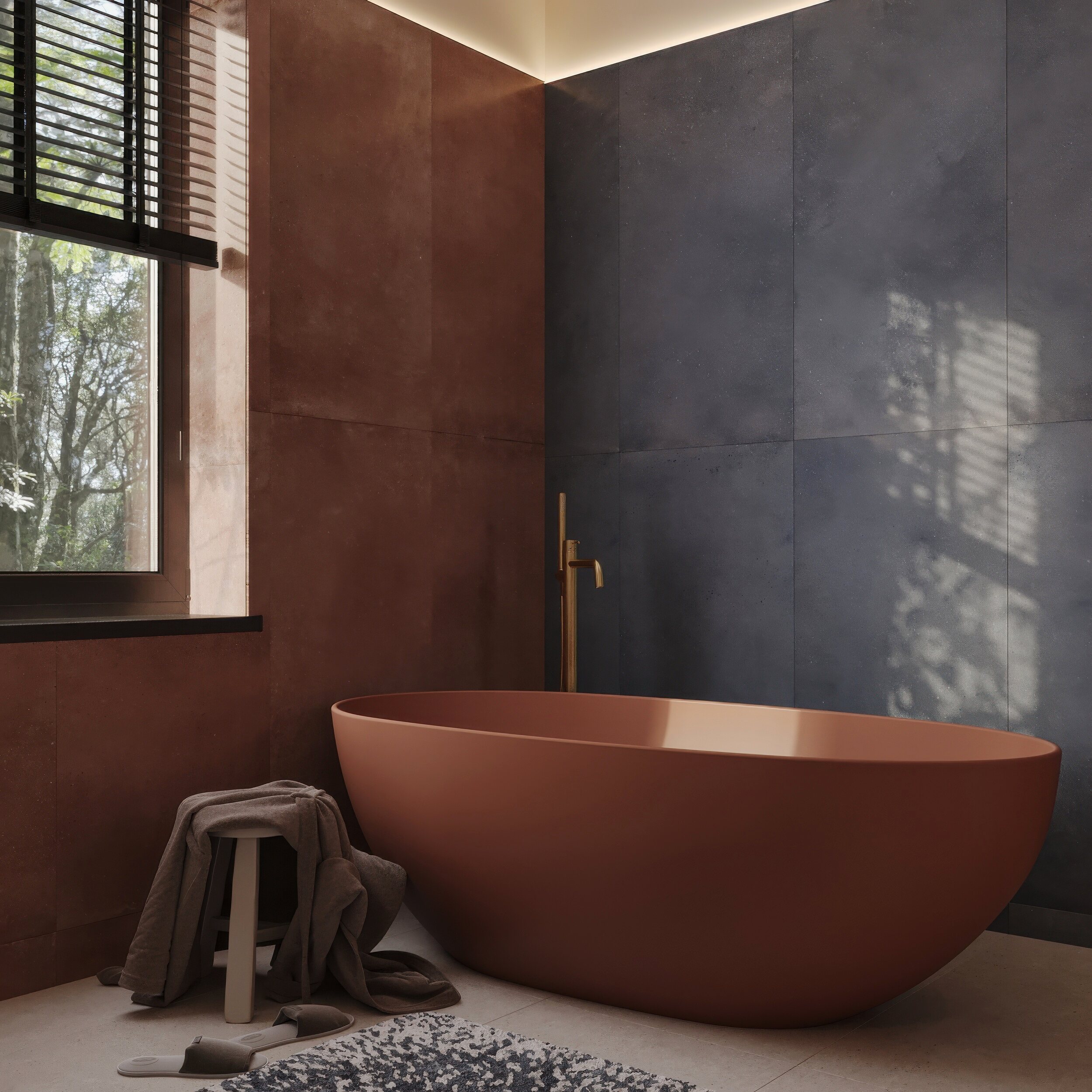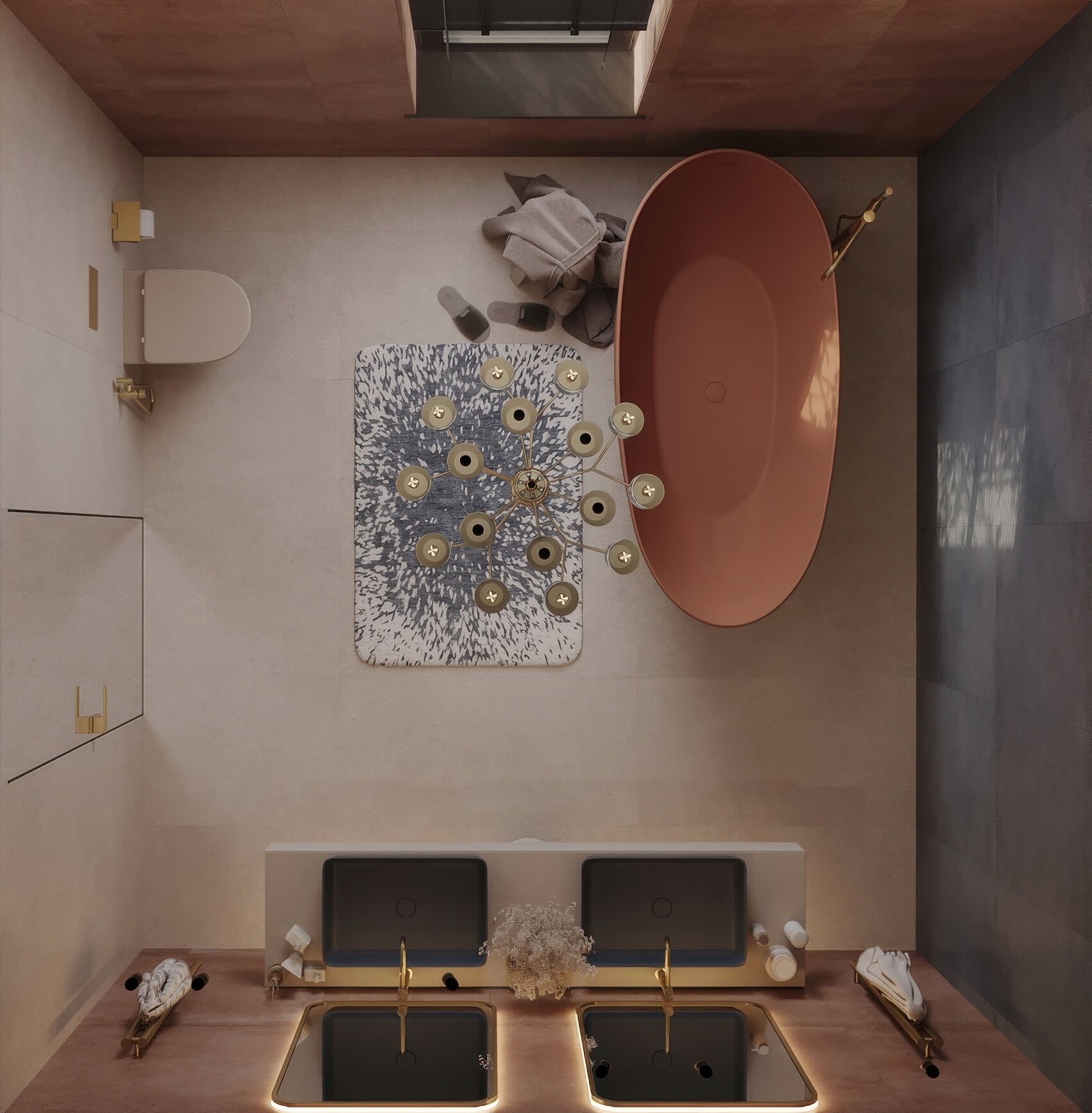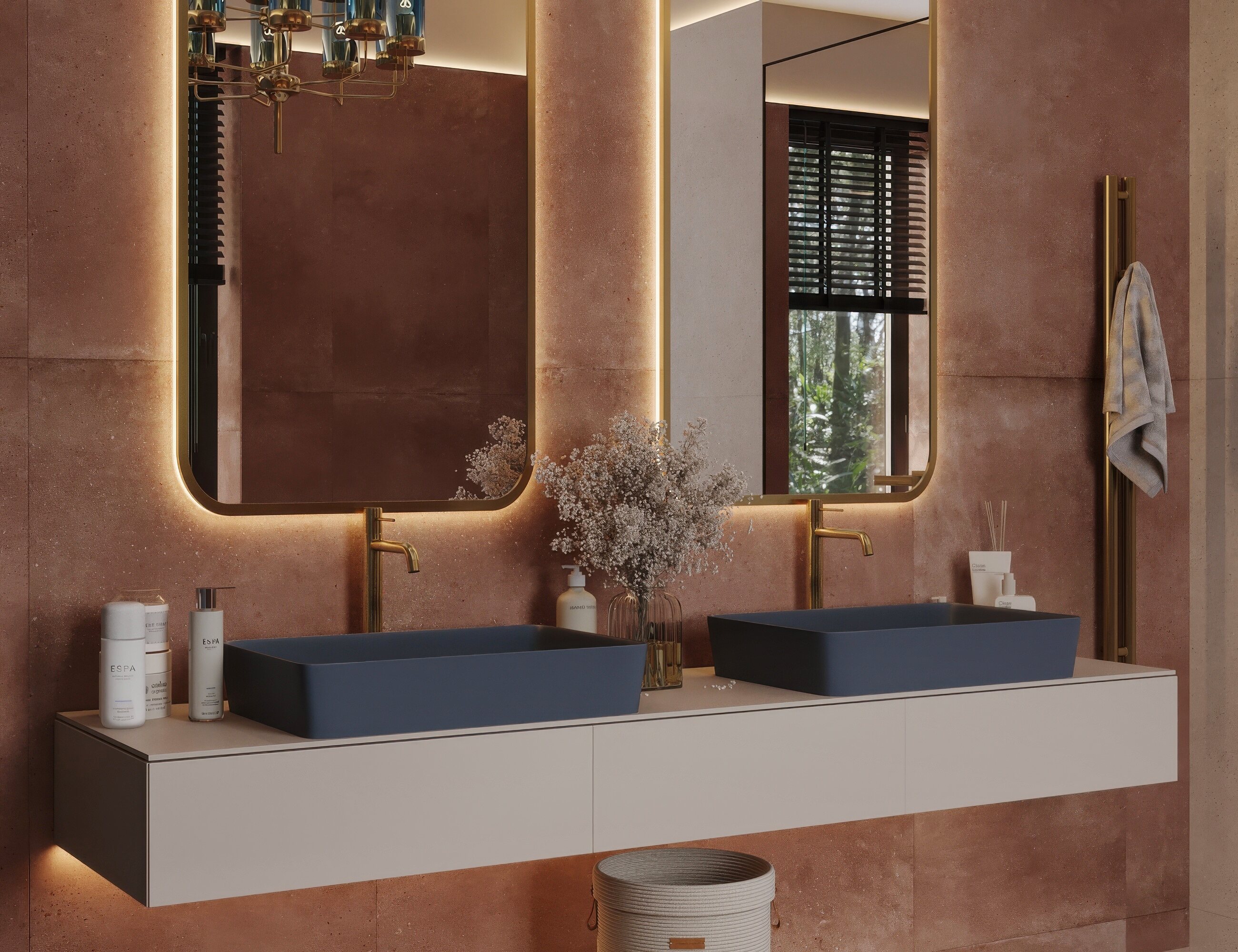 Мастер-санузел для молодой пары, стремящейся к смелым и нестандартным решениям. Основной концепцией стало сочетание двух ярких цветов, что было реализовано с помощью сантехники от Аквамира: отдельно стоящей ванны глубокого терракотового оттенка и выразительной синей раковины. Контрастная палитра гармонично дополняется бежевым унитазом, создавая сбалансированный цветовой ансамбль. Для усиления эффекта плитка была подобрана в тон сантехники, а акцентные элементы — смесители, кнопка смыва, напольный смеситель для ванны — выполнены в элегантном золотом цвете. Такое сочетание материалов и оттенков подчеркивает современный стиль интерьера, придавая пространству индивидуальность и глубину.