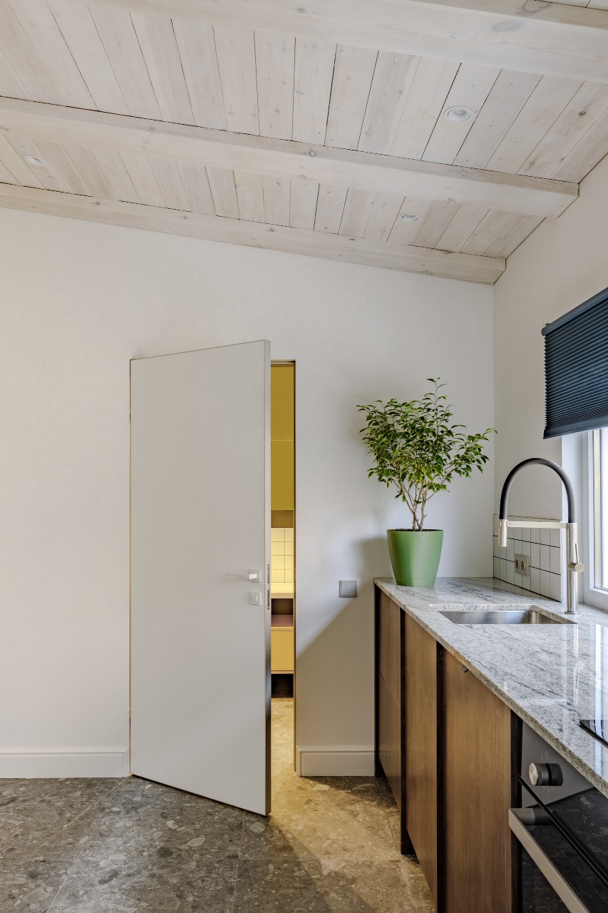 Потолки в пристройке, где находится кухня не стандартные, с уклоном от 3-х до 2,5 метра, их зашили деревянными балками, которые покрыты белой патиной морилкой.