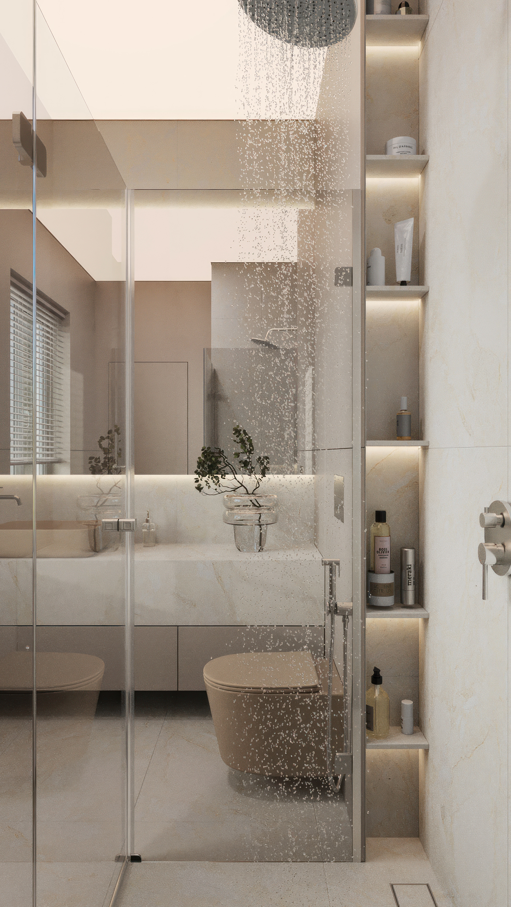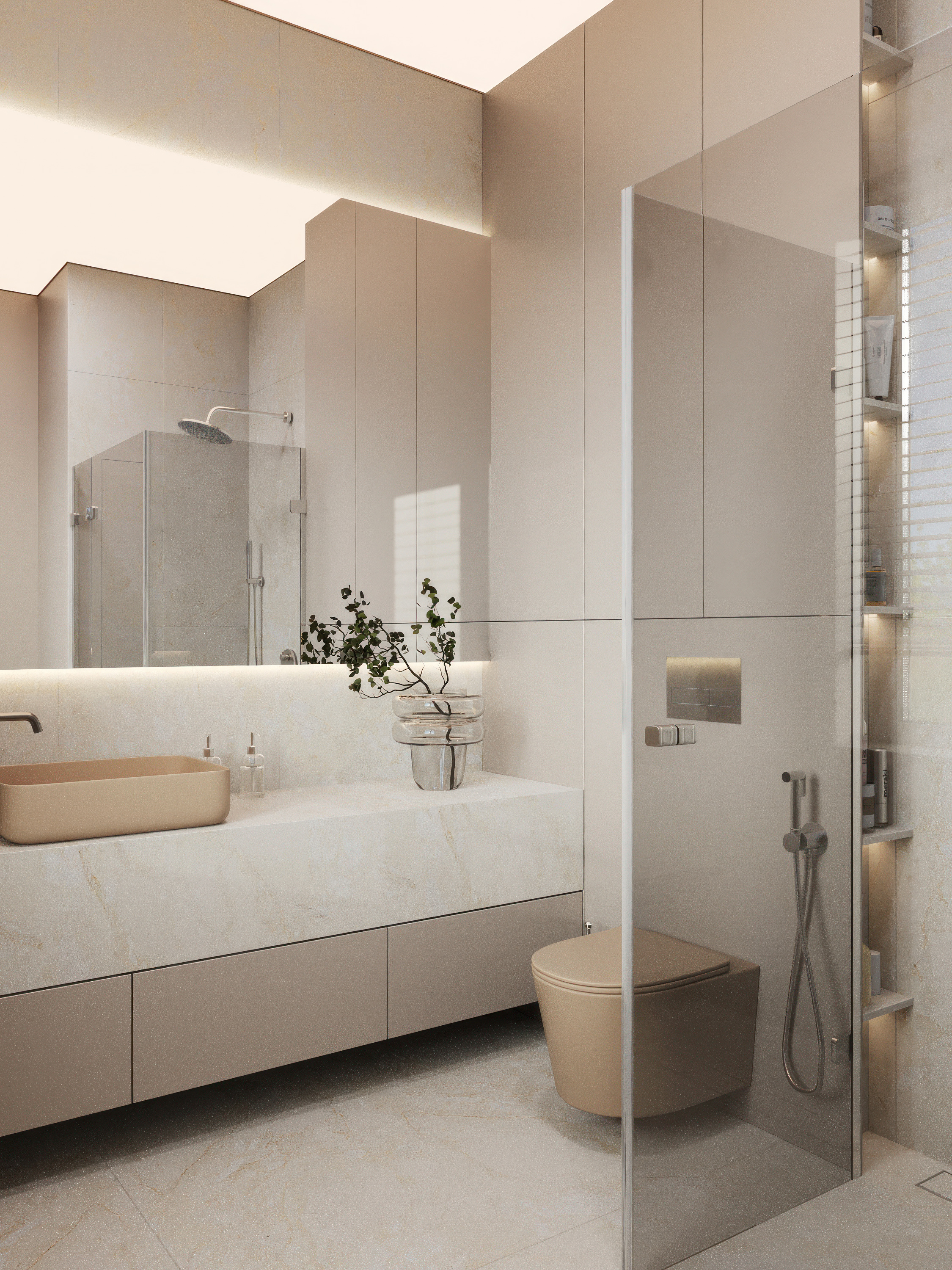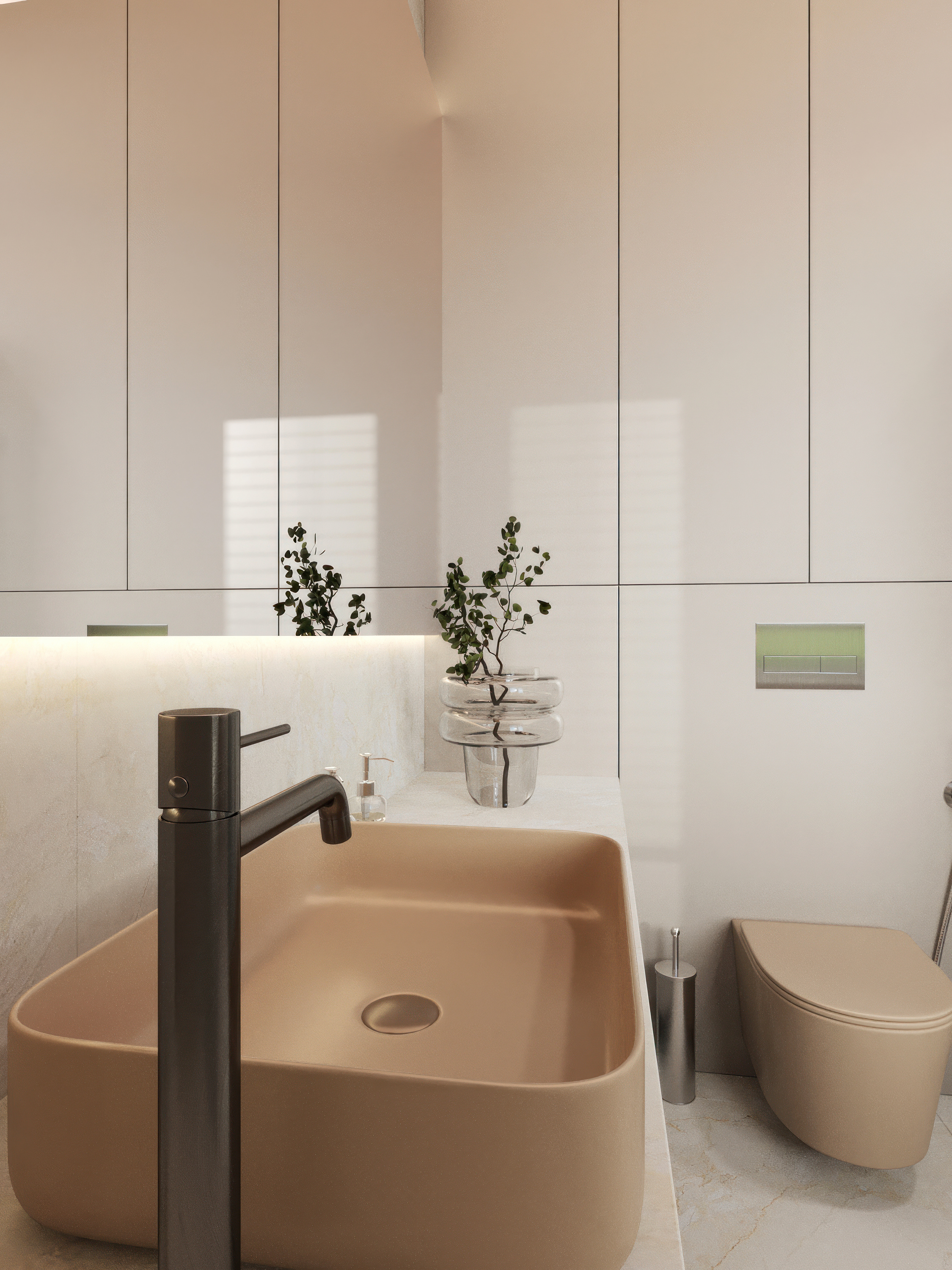 В проекте использованы сочетание новых оттенков коллекции керамики бежевый матовый и сантехники цвет оружейной стали, что делают проект неповторимым.