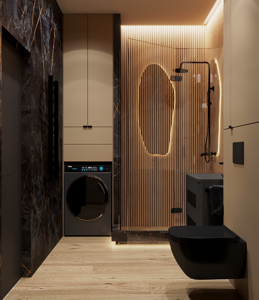Дизайн всей квартиры имеет название "Ласточкино гнездо". Во-первых из-за её расположения на 24 этаже "свечки". Во-вторых из-за её визовых характеристик. Это тот случай, когда форму и цвет диктовало окружение.