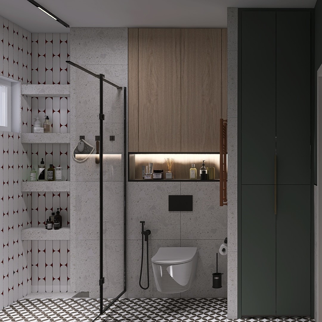 Зеленая стена - оазис посреди городского хаоса. Цвет свежей листвы, пробивающейся сквозь бетонные джунгли, дарит ощущение гармонии и близости к природе. Она наполняет санузел жизнью и энергией, уравновешивая сдержанность тераццо и эксцентричность кабанчика. "Эхо Города" - это гармоничное сочетание городского стиля и природной свежести, современности и ностальгии.