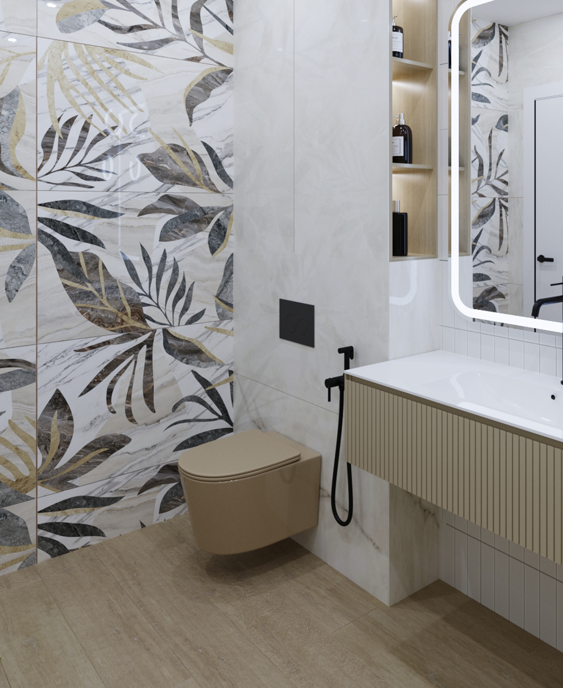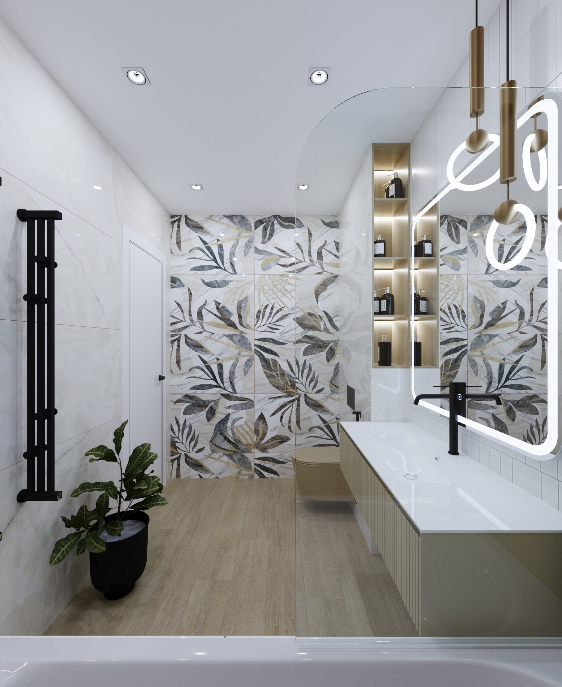 Оформлена в современном стиле для молодой семьи. Основной задачей было создать практичный, легкий и при этом светлый, красивый интерьер, но без значительных затрат. В качестве ключевого акцента выбран унитаз фирмы AVS пастельного оттенка, который эффектно контрастирует с черными деталями: смесителем, кнопкой смыва, душевой лейкой и полотенцесушителем. Для оптимизации пространства спроектирована ниша с полочками сбоку над инсталляцией, обеспечивающая удобное размещение принадлежностей для ванны. Современный выразительный интерьер сочетает в себе продуманную эргономику и утонченную эстетику.